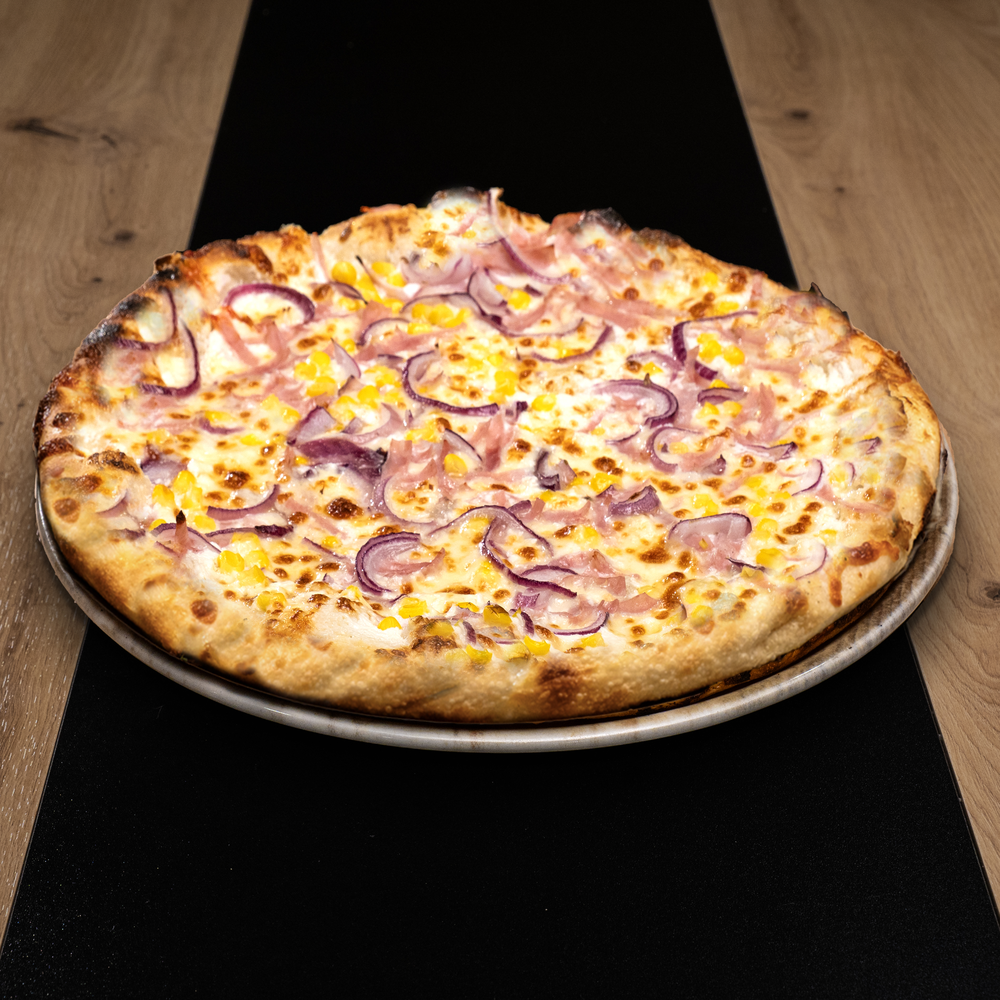Hozzávalók: fokhagymás-tejfölös szósz, sonka, kukorica, hagyma, mozzarella