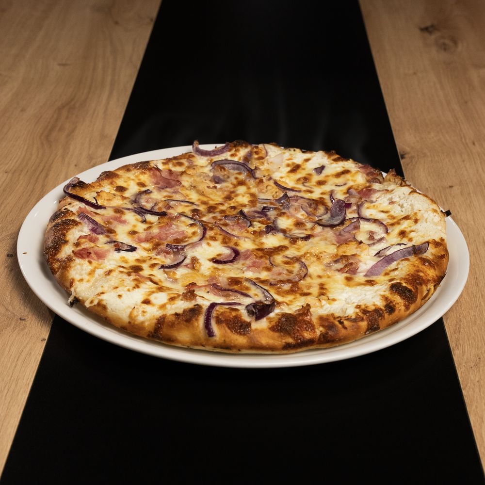 Fokhagymás tejfölös alap, tarja, bacon, csirke, lilahagyma, füstölt sajt