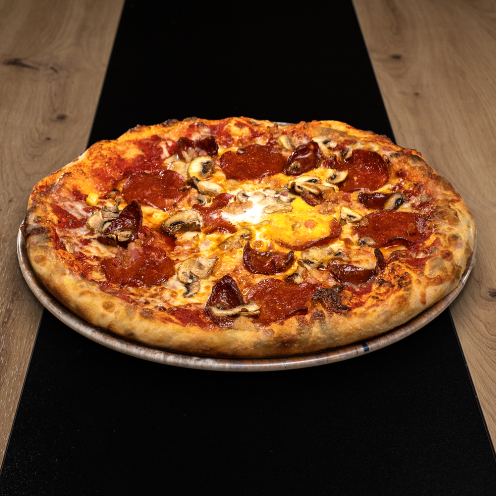 Hozzávalók: p.szósz, szalámi, bacon, kolbász, gomba, tükörtojás, mozzarella