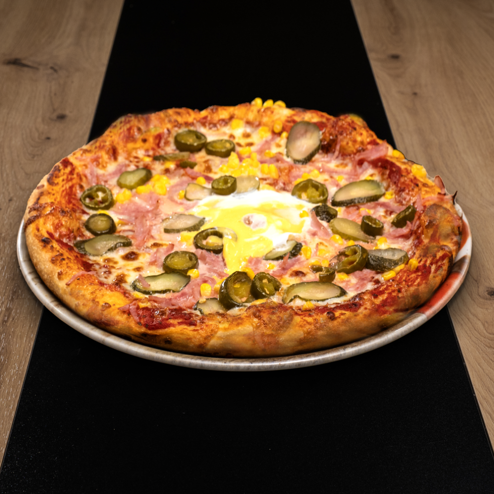 Hozzávalók: p.szósz, sonka, kukorica, csemegeuborka, jalapeno paprika, tükörtojás, mozzarella
