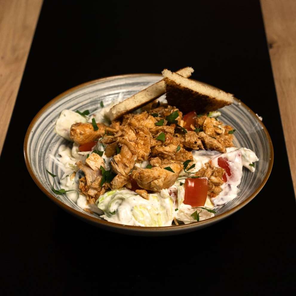Hozzávalók: csirkével vagy tonhallal, jégsaláta, paradicsom, uborka, hagyma, öntet