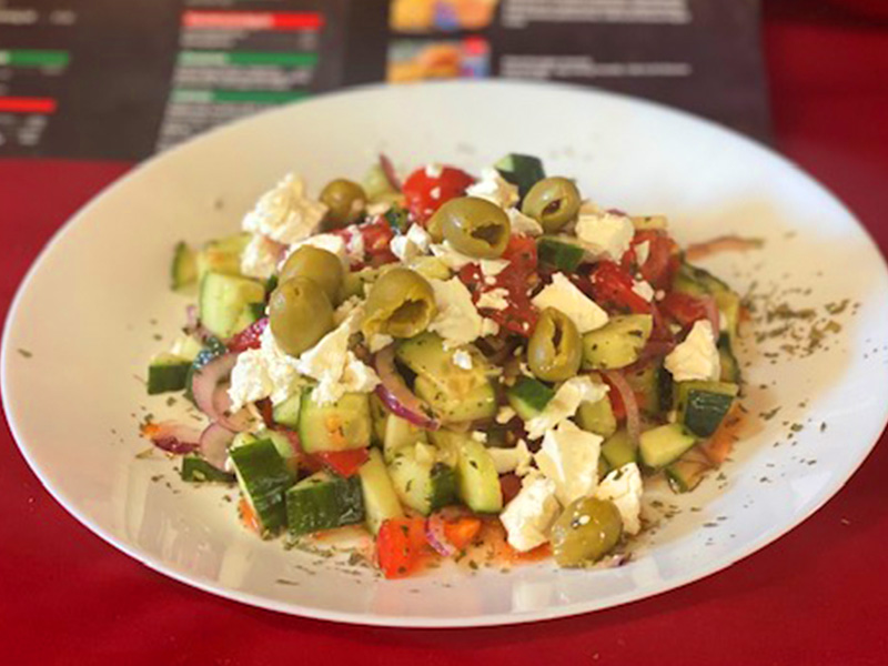 Hozzávalók: paradicsom, uborka, hagyma, feta sajt, olíva